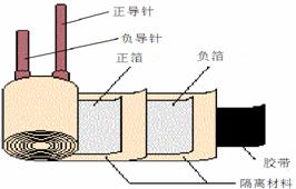 固態(tài)鋁電容器的結(jié)構(gòu)為:正箔和負(fù)箔分別與正、負(fù)導(dǎo)針相連,兩者由隔離材料隔開并重迭卷繞在一起,并由膠帶固定,其中,隔離材料為疏松多孔結(jié)構(gòu),其間填充有導(dǎo)電高分子聚合物;該卷繞結(jié)構(gòu)被鋁外殼和橡膠蓋密封,導(dǎo)針穿過橡膠蓋與外界相通。