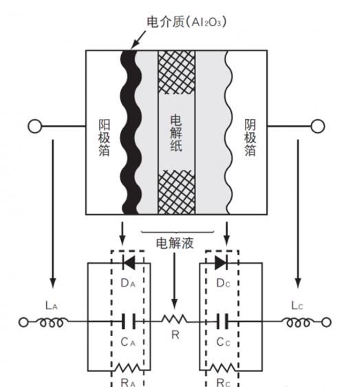 電容的等效電路作為鋁電解電容的電介質(zhì)氧化膜(Al2O3)的介電常數(shù)通常為8~10,這個值并不比其他類型的電容大,但是,通過對鋁箔進行蝕刻擴大表面積,并使用電化學的處理得到更薄更耐壓的氧化電介質(zhì)層,使鋁電解電容可以取得比其他電容器更大的單位面積CV值。